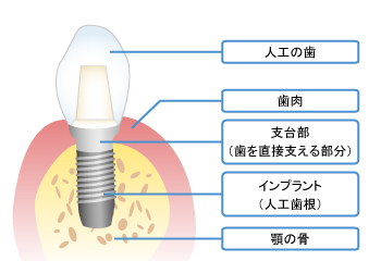 近年よく耳にするようになった「インプラント」ですが、どんなものかご存知でしょうか?そもそも「インプラント」とは「埋め込む」という意味の単語であり、顎の骨にチタン製の人工歯根を埋め込む治療法を指します。チタン製の人工歯根は顎の骨としっかり結合するため、天然歯同様の安定した歯が手に入るのです。